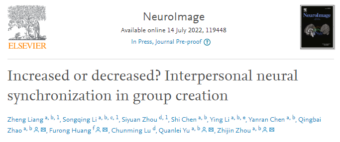 參考文獻Zheng Liang, Songqing Li, Siyuan Zhou, Shi Chen, Ying Li, Yanran Chen, Qingbai Zhao, Furong Huang, Chunming Lu, Quanlei Yu, Zhijin Zhou,Increased or decreased? Interpersonal neural synchronization in group creation,NeuroImage,2022,119448,ISSN 1053-8119,https://doi.org/10.1016/j.neuroimage.2022.119448.