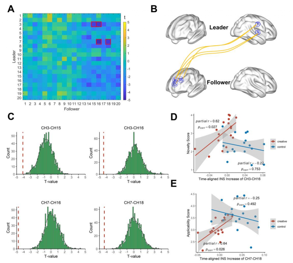 該研究發現在團體創造過程中,個體在行為與神經活動上均表現出了領導者-追隨者角色分化的現象。且相比于一般任務,在團體創造中領導者右側顳頂聯合區(rTPJ)與追隨者左側背外側前額葉(lDLPFC)的人際神經活動耦合較差,這可能與成員在創造活動中難以對方案或意圖形成共同理解、表征及觀點沖突有關。然而,當個體間INS增強時,創造性任務的績效會得到提高,這可能意味著高績效團隊更好地整合創新觀點并達成了共同理解、意圖和目標。此外,不同腦區的INS動態存在差異,與團體創造新穎性有關的INS在任務早期階段下降,而與適用性有關的INS在任務中期階段下降,這可能與創造過程特點有關。該發現揭示了自然交流背景下團體創造的獨特人際神經模式。