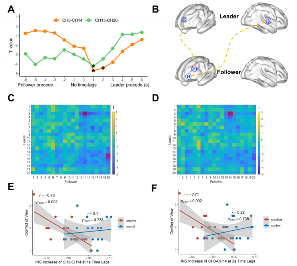 時間滯后結果發現相較一般條件,當領導者的大腦活動先于追隨者的大腦活動1秒時創造性條件下CH3-CH14 (t (32) = -4.70,corrected p = 0.019, Cohen’s d =1.66) and CH15-CH20 (t (32) = -4.22, corrected p =0.038, Cohen’s d = 1.49)INS明顯更低;當領先2s時,CH3-CH14 (t (32) = -4.42, corrected p = 0.043, Cohen’s d = 1.56)有同樣的表現。另外發現,當領導者的大腦活動先于追隨者的大腦活動1秒和2秒時創造性條件下CH3-CH14的INS增強與小組內的觀點沖突成負相關(1-s time lag: rCH3-CH14 = -0.73, corrected pCH3-CH14 = 0.002; 2-s time lag:rCH3-CH14 = -0.71, corrected pCH3-CH14 = 0.002)。
