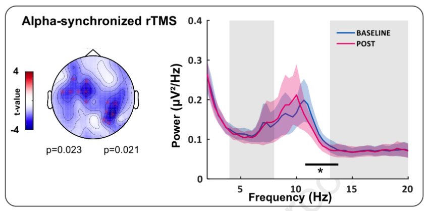 靜息態EEG的聚類統計分析顯示,在α同步rTMS條件下,在11-14 Hz的頻率范圍內,基線測量和治療后的信號功率譜之間存在顯著差異。在600次的α同步TMS脈沖后,左額葉和右頂葉靜息狀態的α功率降低。