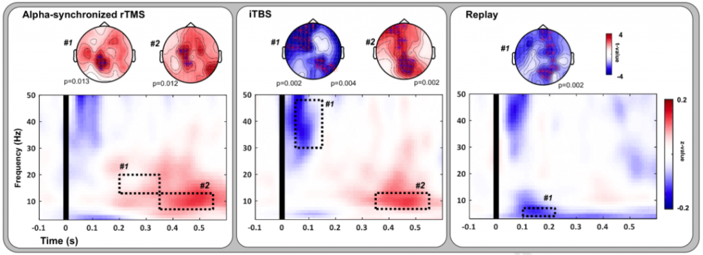 在所有刺激條件下,TMS誘導的振蕩在基線和治療后之間存在顯著差異,具有顯著的通道簇特定模式和時頻響應的變化,且α同步rTMS增加了內側額中心通道上TMS誘導的β振蕩(p=0.013)。