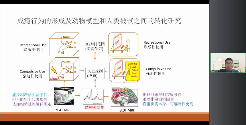 第二個是因為人的成癮,他有很多的社會因素的限制,混淆。比如說他成癮是不是因為他的社交有困難,或者是因為他生活環境里吸毒的人比較多。相反的話動物就比較好操作了,我可以嚴格去控制它一切實驗條件,進行非常精準的控制,非常復雜的策略,但是也有其局限性,比如說動物研究不能完全代表人類疾病。