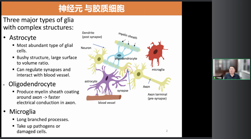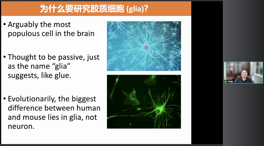 首先感謝主持人的介紹,非常歡迎大家來參加我的報告會。今天的報告是分享過去幾年我課題組一直從事的一項工作,就是如何應用人工智能和機器學習的技術來幫助我們探索膠質細胞在大腦中的作用。