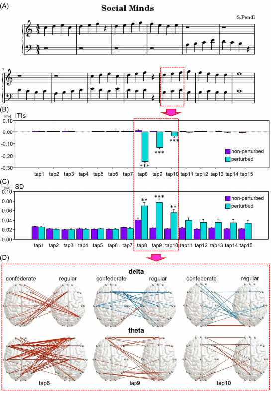 圖1 (A)音樂片段:上排由假被試演奏,假被試在樂曲的二重奏部分暫停后,會在一半的試驗中提前開始演奏。下排由真被試演奏,需要根據(jù)假被試演奏做出反應(yīng),適應(yīng)這種擾動(即調(diào)整自己的演奏節(jié)奏)。(B)演奏時的異步性(Asynchrony):研究通過計算每次點擊(tap)之間的擊打間隔(ITIs,Inter-Tap Intervals),來衡量兩位演奏者的演奏是否同步。異步性是通過比較合作者和常規(guī)參與者之間的ITIs差異來衡量的。(C)演奏的一致性(Constancy):一致性通過計算每次點擊之間擊打間隔的標準差(standard deviation of ITIs)來評估,標準差越大,表示演奏的變異性越大,演奏的時序越不穩(wěn)定。(D)大腦連接性圖譜(Connectivity Maps)