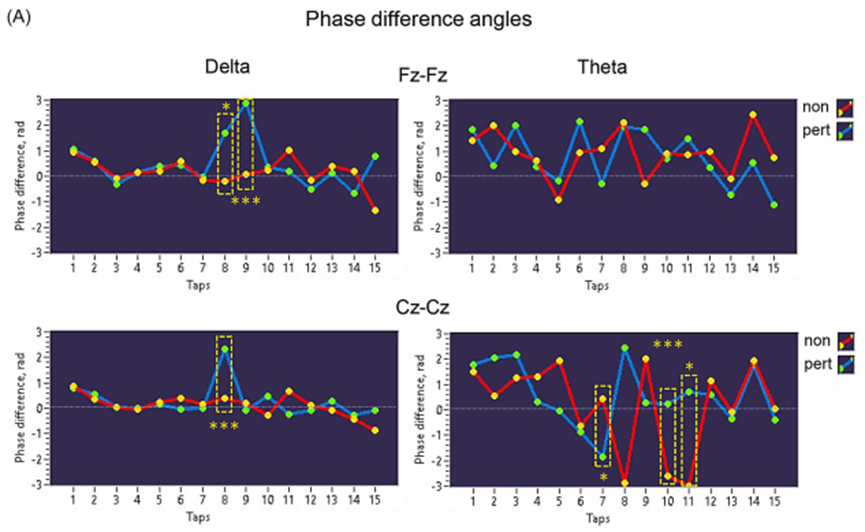 腦間同步應(yīng)當反映的是感覺-運動對準和協(xié)調(diào)行為的認知需求,特別是在應(yīng)對擾動時,擾動期間 IPC 的增加可能與注意力的提升和適應(yīng)性行為相關(guān),因為音樂家在試圖重新同步時增加了腦部活動。相位對準分析表明,在擾動過程中,鋼琴演奏者的大腦活動與行為啟動去同步化緊密關(guān)聯(lián),揭示了聯(lián)合音樂表演中實時協(xié)調(diào)背后的神經(jīng)機制。