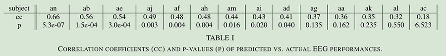 結果發現  在表格1中中優化問題,通過表格2可以看出,在14名被試中,9名被試的腦電性能表現和預測之間不具有顯著相關性。表2中可以看出所有被試的分類均值,所有訓練階段的刺激和元分類的四種類別間的配對樣本T檢驗,其block的性能顯著為0.013。