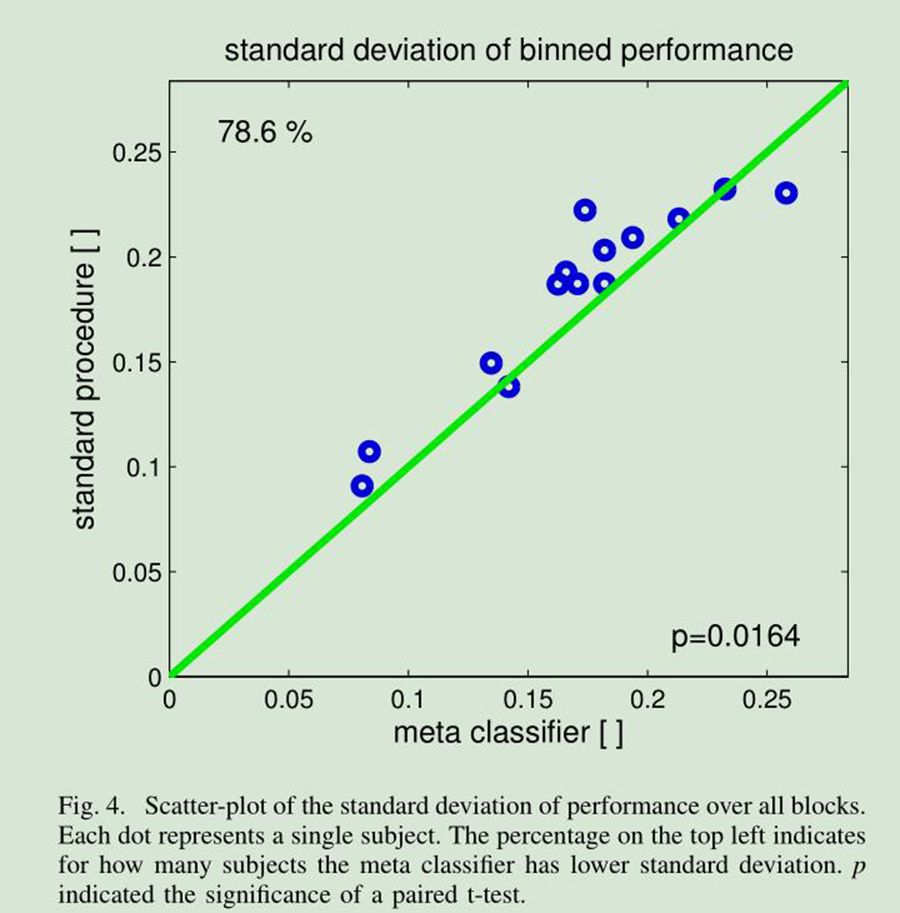 為了評估我們的方法是否在反饋過程中降低了性能的可變性,我們計算標準方法的所有60個Block的標準偏差,所有的試驗都是相同的,以及元分類器。圖4顯示了一個散點圖的結果。可以看出,我們提出的方法減少了14個被試中11個被試:表現的可變性,其中一個被試的可變性是相同的,而對于兩個被試,標準過程的績效波動比較低。配對樣本T檢驗揭示了p小于0.05的顯著關系。