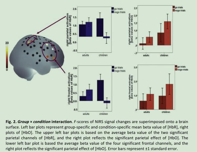 另外一項(xiàng)例子是關(guān)于反應(yīng)抑制能力的,即廣泛使用的 GO/NOGO 范式所進(jìn)行的測(cè)量,反應(yīng)抑制,是執(zhí)行功能的一個(gè)重要成份,對(duì)做出正確行為的決策,以適應(yīng)任務(wù)變化的要求有重要作用,其功能發(fā)展于兒童早期。行為數(shù)據(jù)表明,到 3 歲時(shí),孩子已經(jīng)基本掌握評(píng)估響應(yīng)抑制任務(wù)的要求,但要直到 7 歲左右才能表現(xiàn)出能力提高。但是,在這發(fā)育過(guò)程中改變的神經(jīng)機(jī)制尚不清楚。在本研究中,研究者通過(guò)在近紅外(fNIRS)腦成像過(guò)程中應(yīng)用“GO/NOGO”范式,測(cè)量了 4 至 6 歲兒童的腦激活模式和行為表現(xiàn)。我們發(fā)現(xiàn)與成人相比,兒童與抑制相關(guān)的右側(cè)額頂--前額葉激活減少。相反,運(yùn)動(dòng)相關(guān)的激活在年齡組之間沒(méi)有差異。我們的研究結(jié)果表明,在 4-6 歲年齡的兒童中,額頂腦成熟在抑制反應(yīng)的認(rèn)知發(fā)展中起著至關(guān)重要的作用。3