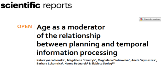 本研究Age as a moderator of the relationship between planning and teImporal information processing發表于2022年的Scientific Reports(IF:4.6),華沙社會科學與人文大學的Katarzyna Jablonska等人為本文的第一作者。