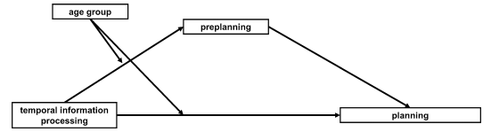 據此,本研究假設預先計劃(用ITT測量)在時間信息處理(TIP)和計劃中起中介作用,且年齡在時間信息處理和計劃、預先計劃之間起調節作用(圖1)。