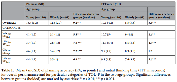 PA在兩組之間的整體表現以及特定類別都存在顯著差異。年輕的參與者比年長的參與者得分更高,反映出年輕人具有更強的計劃能力(表1)。
