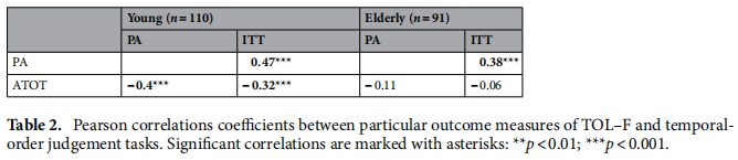 除此之外,兩個年齡組的兩項TOL-F指標(PA和ITT)之間的相關性均顯著,說明PA值越高,預計劃階段持續時間越長。這表明測試表現出的內在一致性與年齡無關。