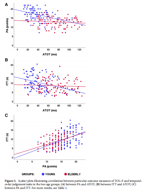 TIP只對年輕人的計劃有顯著影響。可能是因為TOL-F涉及認知過程的本質,即工作記憶容量(反映在SD中)和認知靈活性(反映在GA中)。隨著年齡的增長,這兩項功能都有所下降,因而對老年人沒有顯著影響。