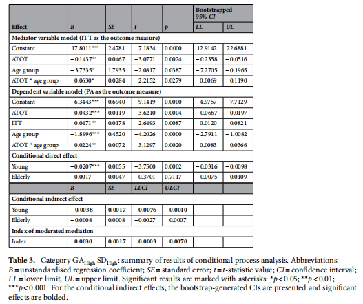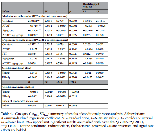 同樣的,年齡通過ITT調節了ATOT對PA的間接作用(IMM不含零:IMM=0.0030,CI=[0.0003, 0.0070])。在年輕組中具有顯著影響(B=-0.0038, CI=[-0.0076,-0.0010]),但在老年組中沒有顯著影響。